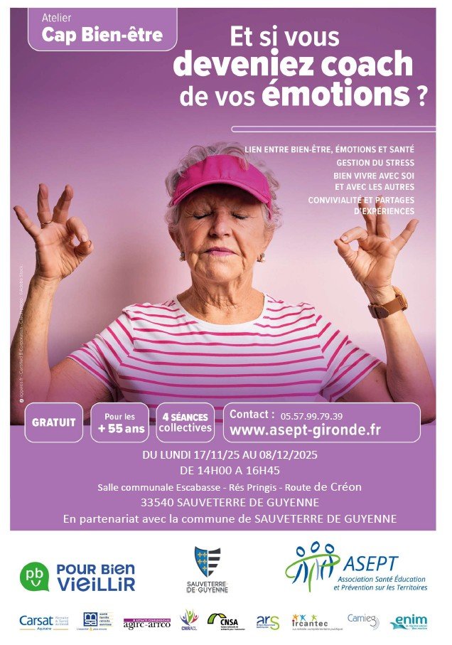 ASEPT Gironde vous invite - en partenariat avec le CCAS de Sauveterre-de-Guyenne - à l’atelier CAP Bien-Être en salle communale Albert Escabasse, Résidence Pringis, Route de Créon) :