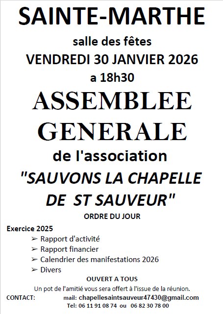 L'Association "Sauvons la Chapelle de Saint-Sauveur" tiendra son assemblée générale le vendredi 30 janvier, à 18h30, à la salle des fêtes de Sainte-Marthe.