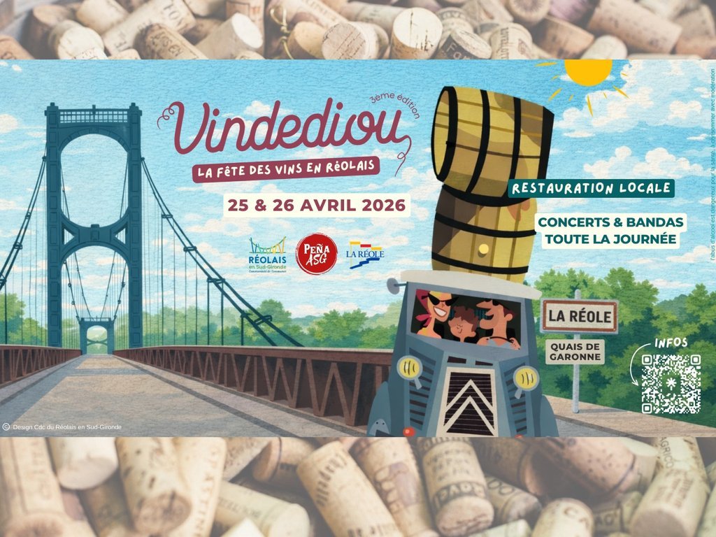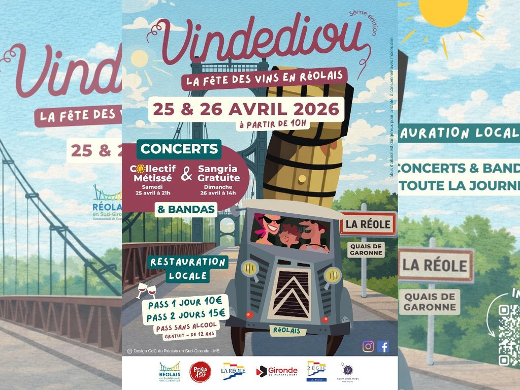 Vindediou, la Fête des vins en Réolais fera son grand retour les 25 et 26 avril 2026 à La Réole. Pour une édition exceptionnelle sur deux jours, au bord de la Garonne. Un rendez-vous pour les épicuriens où le bon vin rencontre la bonne cuisine. Cet événement festif mettra à l’honneur les vins du Réolais avec la présence de 35 vignerons, des dégustations, une offre gourmande, des animations et des concerts tout au long du week-end. Parmi les temps forts, le concert de Collectif Métissé le samedi à 21 h et Sangria Gratuite le dimanche à 14 h, bandas tout le week-end. Pour en savoir plus, rendez-vous sur nos pages Facebook et Instagram.